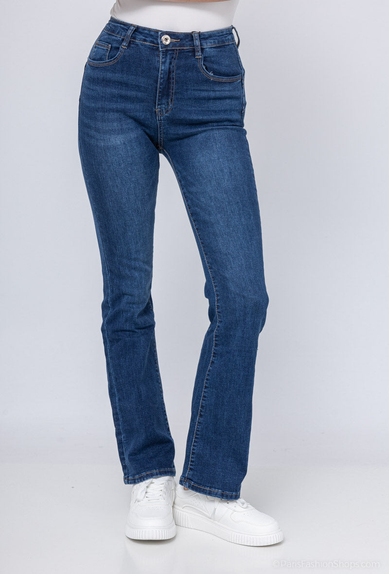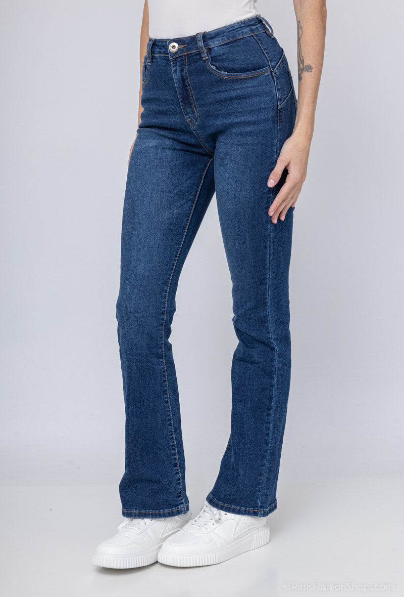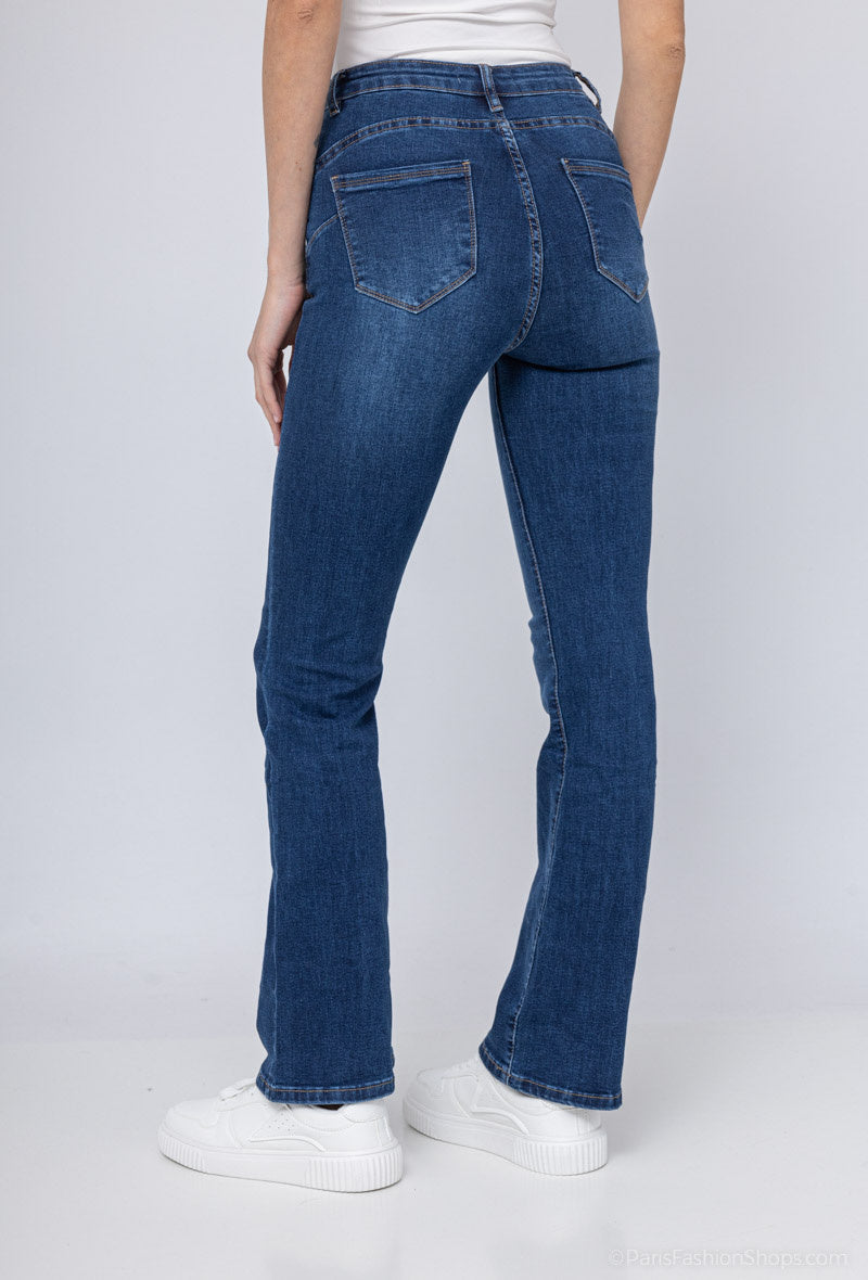 These high-rise flared jeans use advanced stretch denim and a sculpting cut to smooth the waist and create an elongated silhouette. Expert tailoring and reinforced seams provide long-lasting durability while maintaining shape through frequent wear. A contemporary raw hem and refined seam detailing make these jeans versatile for both casual and smart-casual outfits. Available in a classic indigo wash with a comfortable mid-weight suitable across autumn/winter and spring/summer wardrobes.