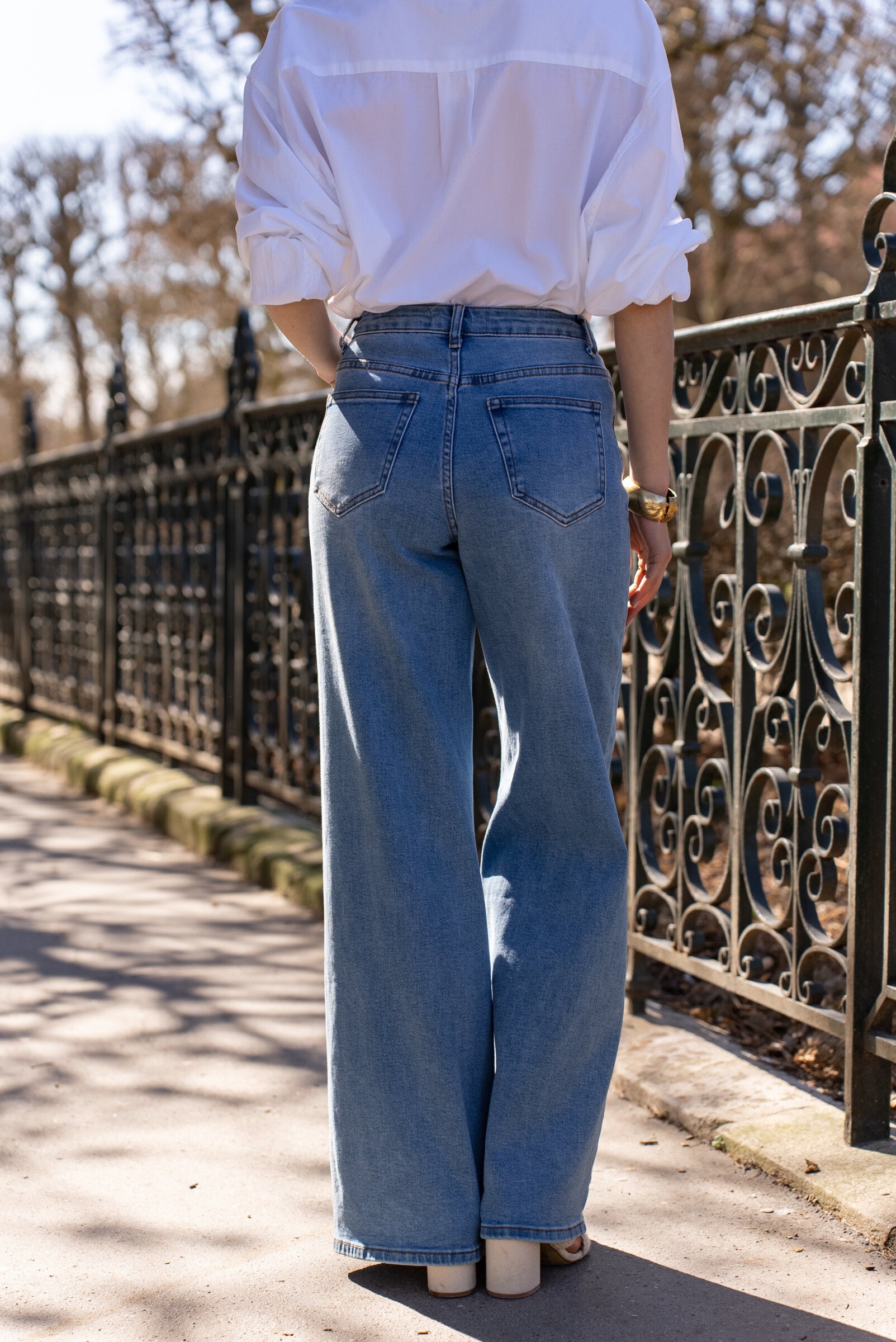Crafted from a durable stretch denim blend, these high-waist palazzo jeans deliver structured drape and comfortable all-day movement. The wide-leg silhouette flatters fuller figures while offering superior breathability and a tailored appearance for autumn/winter or spring/summer wardrobes. A zip fly with secure button closure and reinforced seams ensure reliable wear and straightforward care. Machine-washable fabric and consistent grading across sizes make this style an efficient, low-maintenance option for retail or wholesale stockists. Order now to while still available!